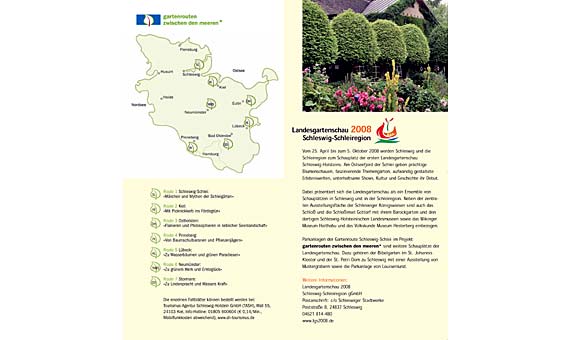 Konzeptionelle Entwicklung, Zusammenstellung der Inhalte und Erstellung der Fotos für einen gedruckten Veranstaltungskalender zum Projekt gartenrouten zwischen den meeren* als Teil der Öffentlichkeitsarbeit der Tourismus-Agentur im Rahmen der Landesgartenschau 2008 in Schleswig.